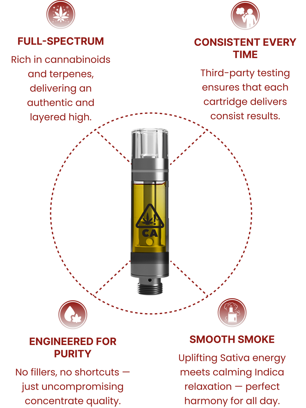 Our vape cartridges are crafted with precision, delivering a full-spectrum experience that’s consistent every time. Engineered for purity and smooth smoke, they set the standard for quality you can trust.