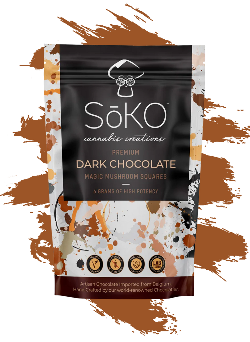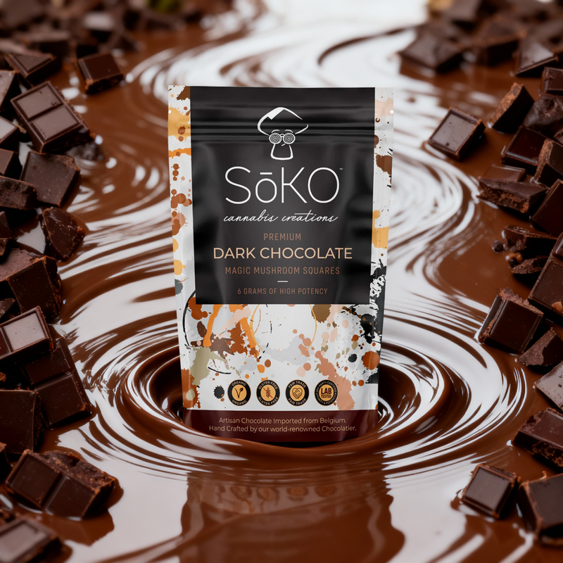 SōKO Premium Dark Chocolate Magic Mushroom Squares deliver a luxurious fusion of artisan Belgian chocolate and high-potency magic mushroom infusion. Handcrafted by our world-renowned chocolatier, each 6‑gram square is pure and free from THC, amanita, and other chemicals.